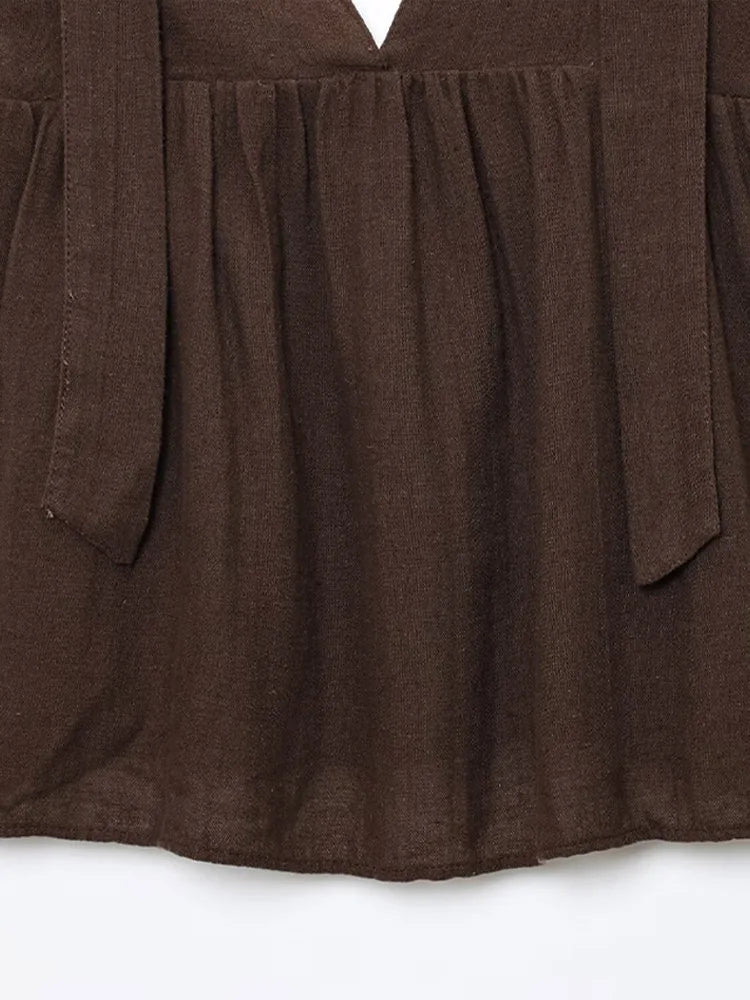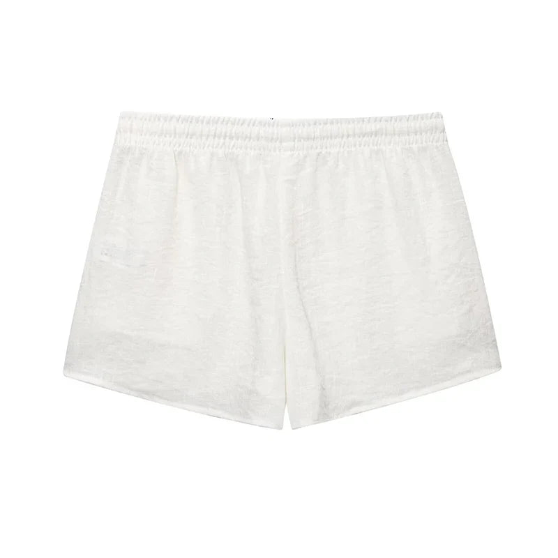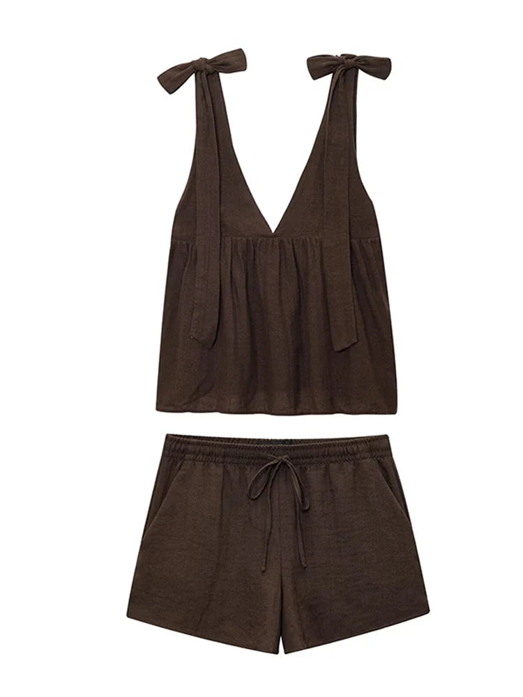 Sublimez votre look estival avec l'ensemble Emilia : un top dos nu sans manches orné de nœuds et un short large assorti. Son décolleté en V plongeant et ses plis délicats créent une silhouette féminine et aérienne, idéale pour les journées ensoleillées ou les moments de détente.